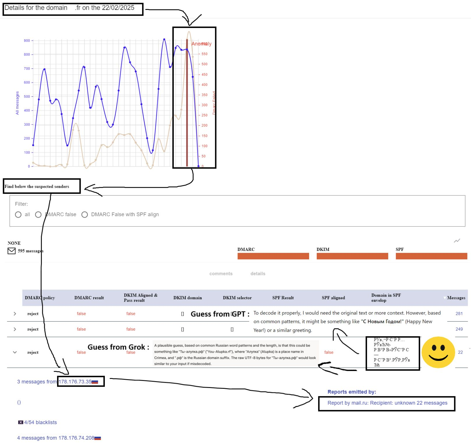 Analyzes DMARC aggregate and forensic reports to identify email authentication issues.