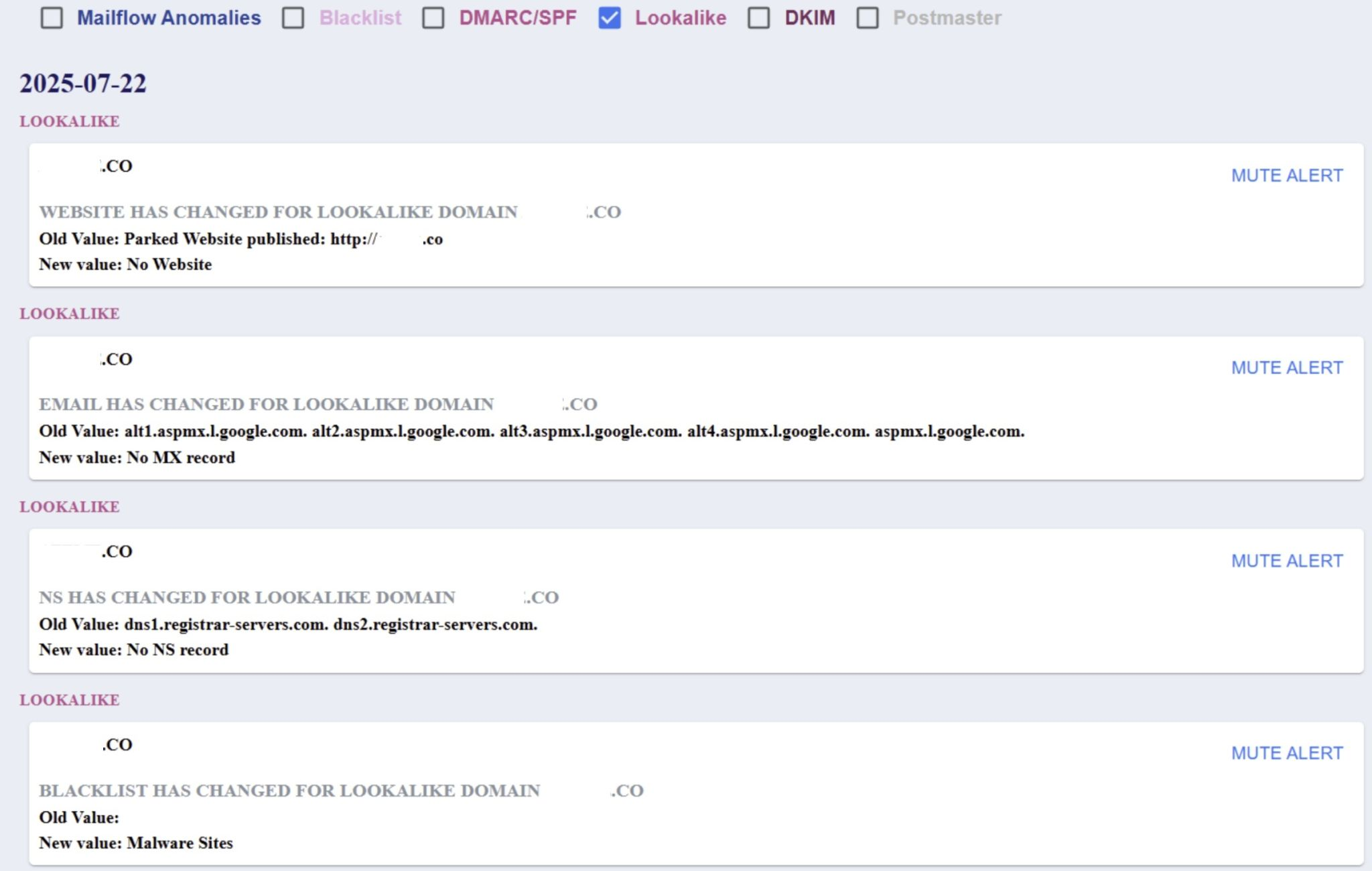 Monitors changes to critical DNS records (SPF, DKIM, DMARC, MX, A records).
