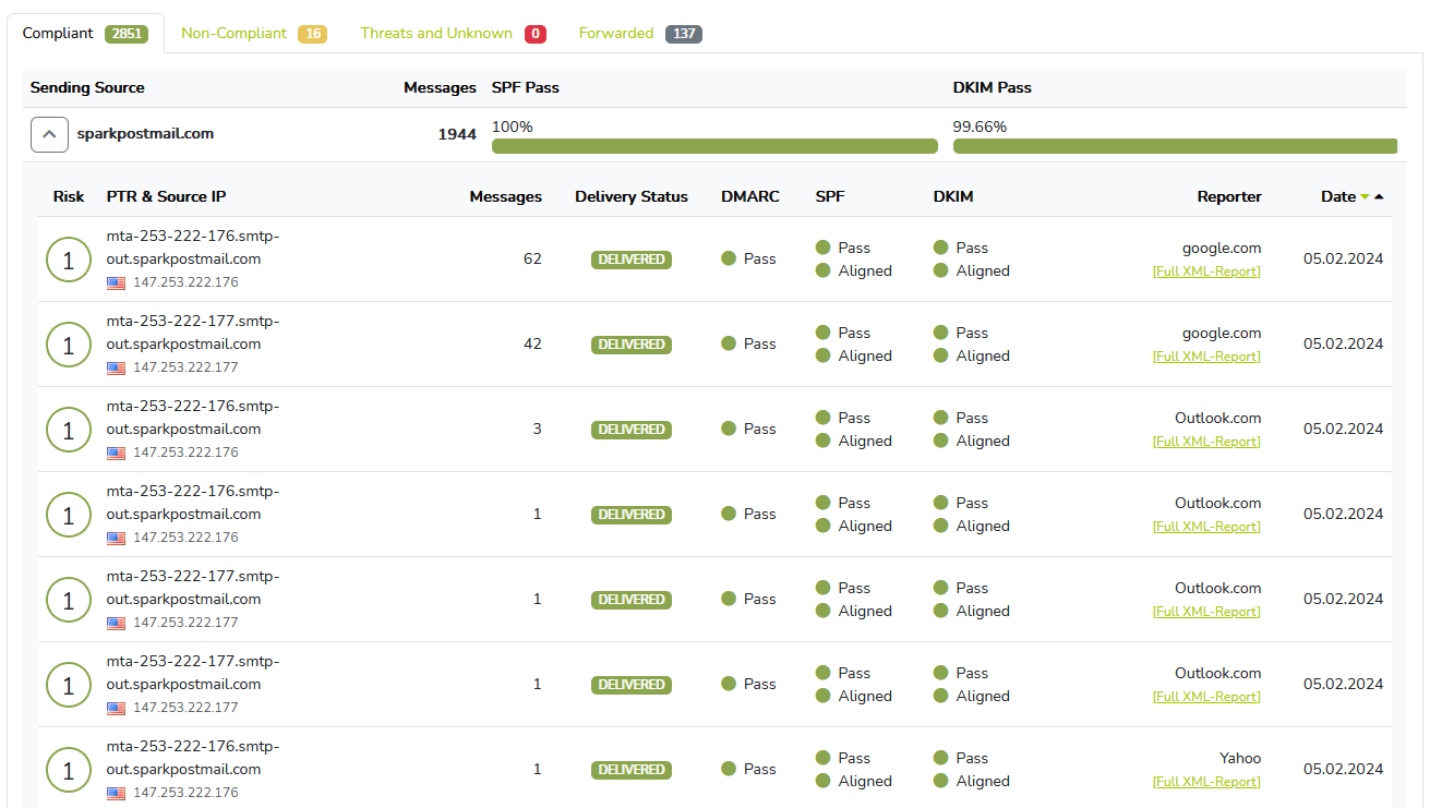 Eunetic provides a straightforward DMARC report analysis tool, focusing primarily on aggregating and presenting DMARC RUA data. We've used it to get a clear overview of our DMARC compliance and see where our emails are authenticating or failing.